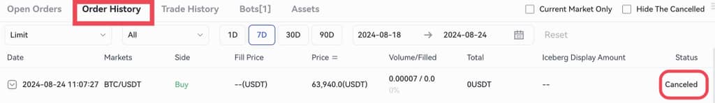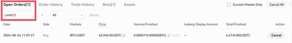 Devam eden limit emirlerini ve detaylarını kontrol etmek için “Açık Emirler”- “Limit”e tıklayın. Gerçekleşmiş limit emirler “İşlem Geçmişi” ve “Emir Geçmişi”nde görülebilir. İptal edilen bir limit emri sadece “Emir Geçmişi”nde görülebilir.