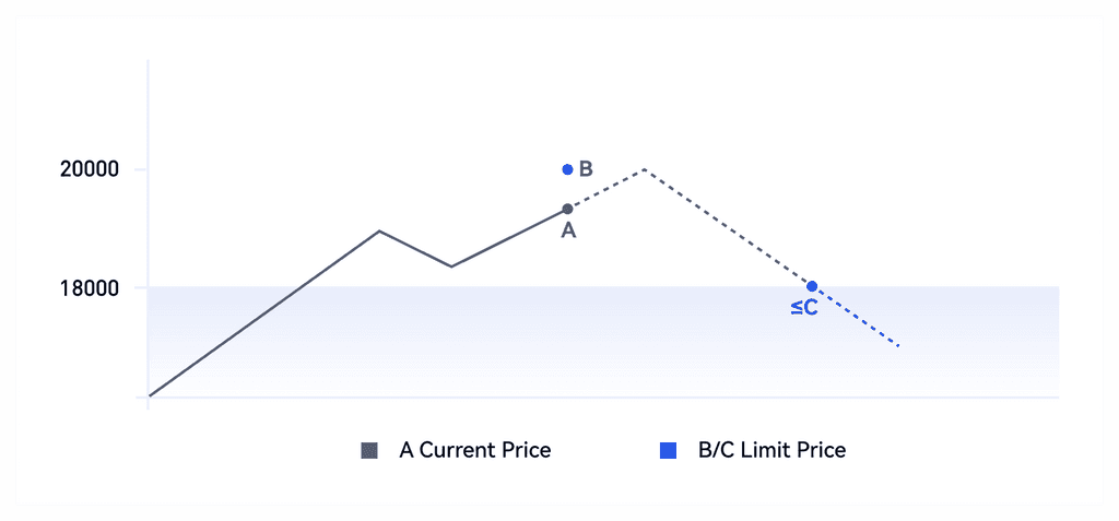 BTC'nin mevcut fiyatının 19000,00 USDT(A) olduğunu ve 20000,00 USDT(B) fiyatından bir miktar BTC satmak istediğinizi varsayalım, 20000 USDT limit fiyatlı bir limit satış emri verebilirsiniz. Fiyat B'ye veya üstüne çıktığında, limit emri doldurulacaktır. Limit fiyatını güncel fiyattan daha düşük olan 18000,00 USDT(C) olarak ayarlarsanız, limit emri hemen yerine getirilecektir. Doldurma fiyatı, C yerine A fiyatına yakın olacaktır.