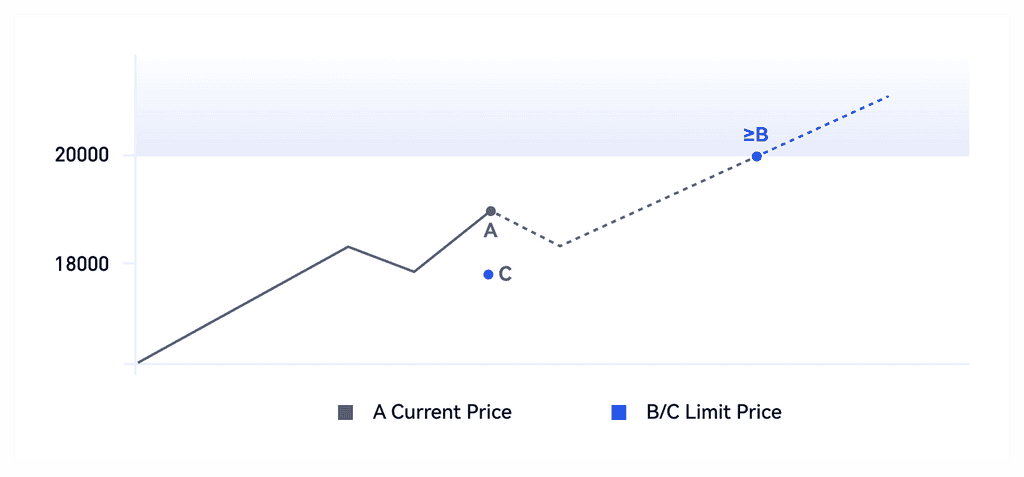 BTC'nin şu anki fiyatının 19000,00 USDT(A) olduğunu ve 18000,00 USDT(C) fiyatından bir miktar BTC satın almak istediğinizi varsayalım, 18000,00 USDT limit fiyatı ile limit alış emri verebilirsiniz. Fiyat C veya altına düştüğünde, limit emri doldurulacaktır. Limit fiyatını güncel fiyattan daha yüksek olan 20000,00 USDT(B) olarak ayarlarsanız, limit emri hemen yerine getirilecektir. Doldurma fiyatı, B yerine A fiyatına yakın olacaktır.