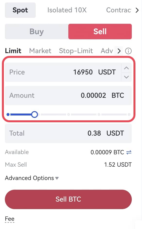 BTC'yi 16950,00 USDT fiyatından satmak istiyorsanız, 16950,00 USDT fiyatı ile limit emri verebilirsiniz. Satmak istediğiniz BTC miktarını doğrudan girebilir veya satmak istediğiniz BTC miktarının yüzdesini seçmek için kaydırıcıyı hareket ettirebilirsiniz. Örneğin, cüzdanda 1.302 BTC var ve kaydırıcıyı bunların yüzde 25'ini satacak şekilde hareket ettiriyorum, sistem satış miktarını ve alacağım toplam USDT'yi otomatik olarak hesaplayacak.