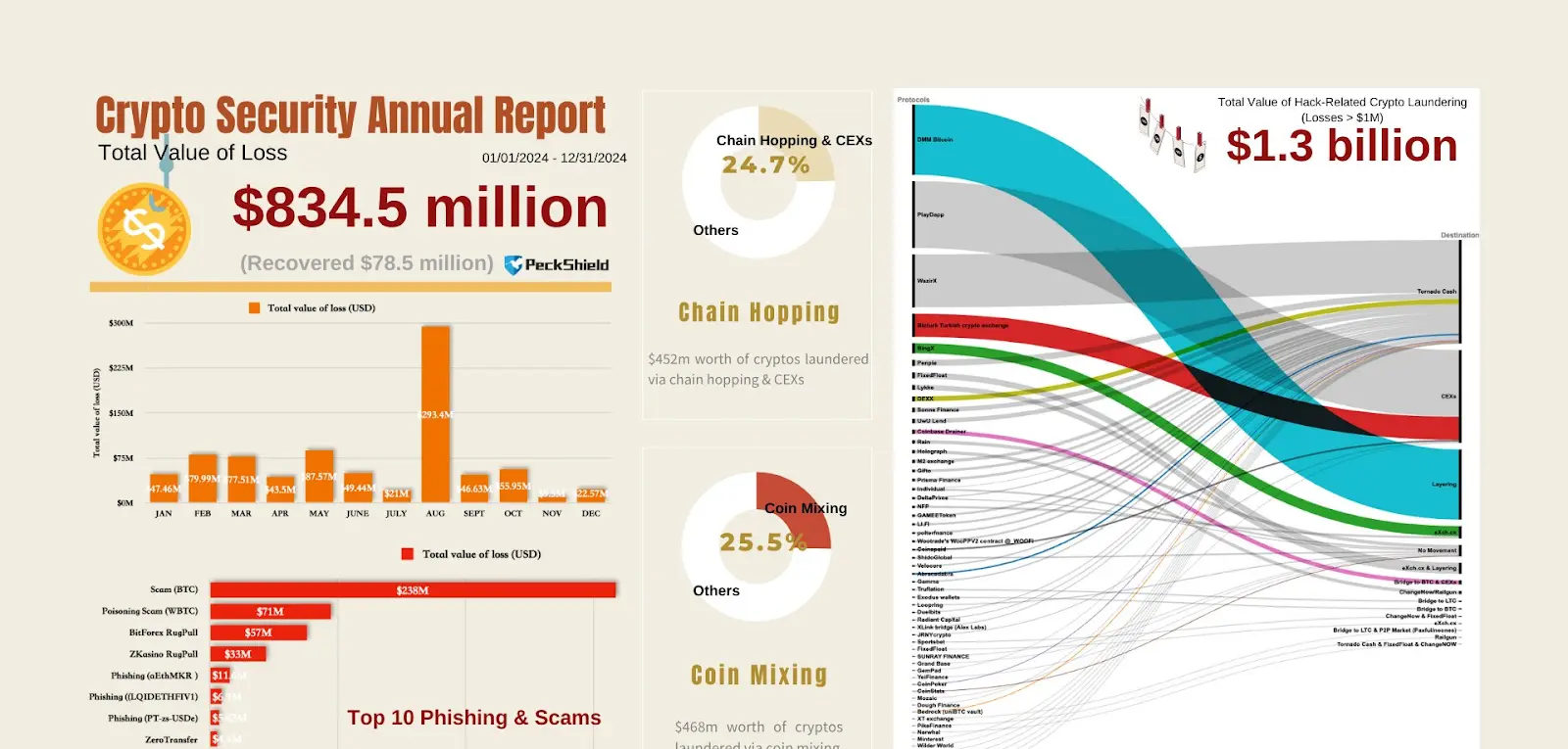 PeckShield’s 2024 report, released in January 2025, adds further concern. It recorded about $834.5 million stolen through scams (on top of $2.15 billion lost to hacks), with scam-related losses continuing to grow year over year.