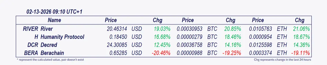 Humanity Protocol and River: These cryptocurrencies have been the best performers over the past 24 hours, with Humanity Protocol posting the crypto market’s most significant intraday gain since midnight, rising 10.96%. 💡Bullish Momentum H’s decoupled surge on high volume points to strong, coin-specific interest, though the absence of a public catalyst invites caution. Key watch: Monitor if daily volume remains above $40 million to distinguish sustained accumulation from a fleeting spike.