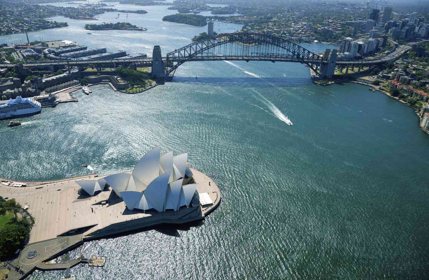 Aerial view of Sydney Harbour, Opera House, and Bridge.