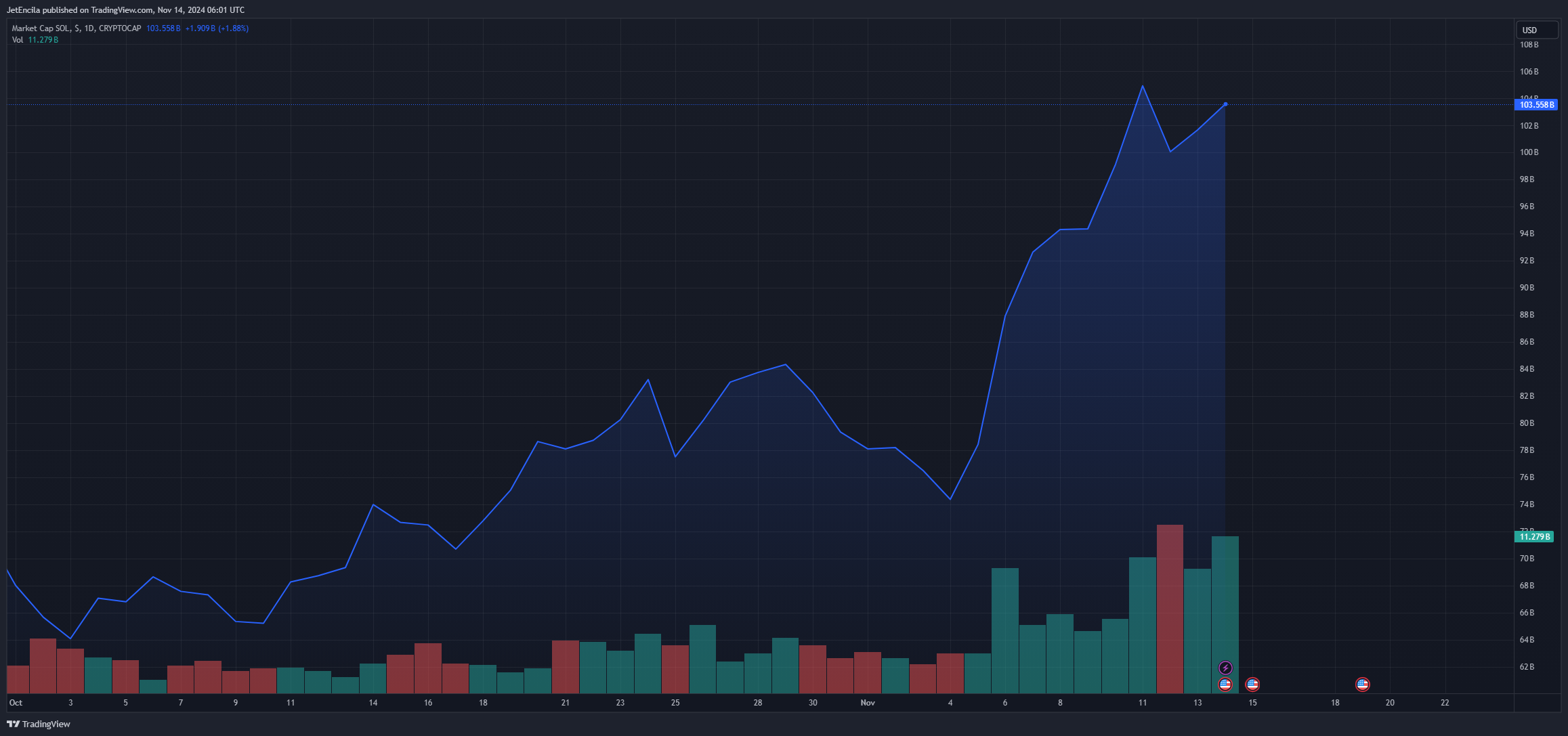 With about 42 million SOL locked as of October 26, Solana’s TVL has reached a two-year high. By contrast, Ethereum’s TVL has stayed somewhat unchanged – particularly in decentralized finance (DeFi) and decentralized physical infrastructure networks (DePIN) – which are both seeing a spike in usage on the platform. This rise in TVL reflects the growing confidence in Solana’s eco.