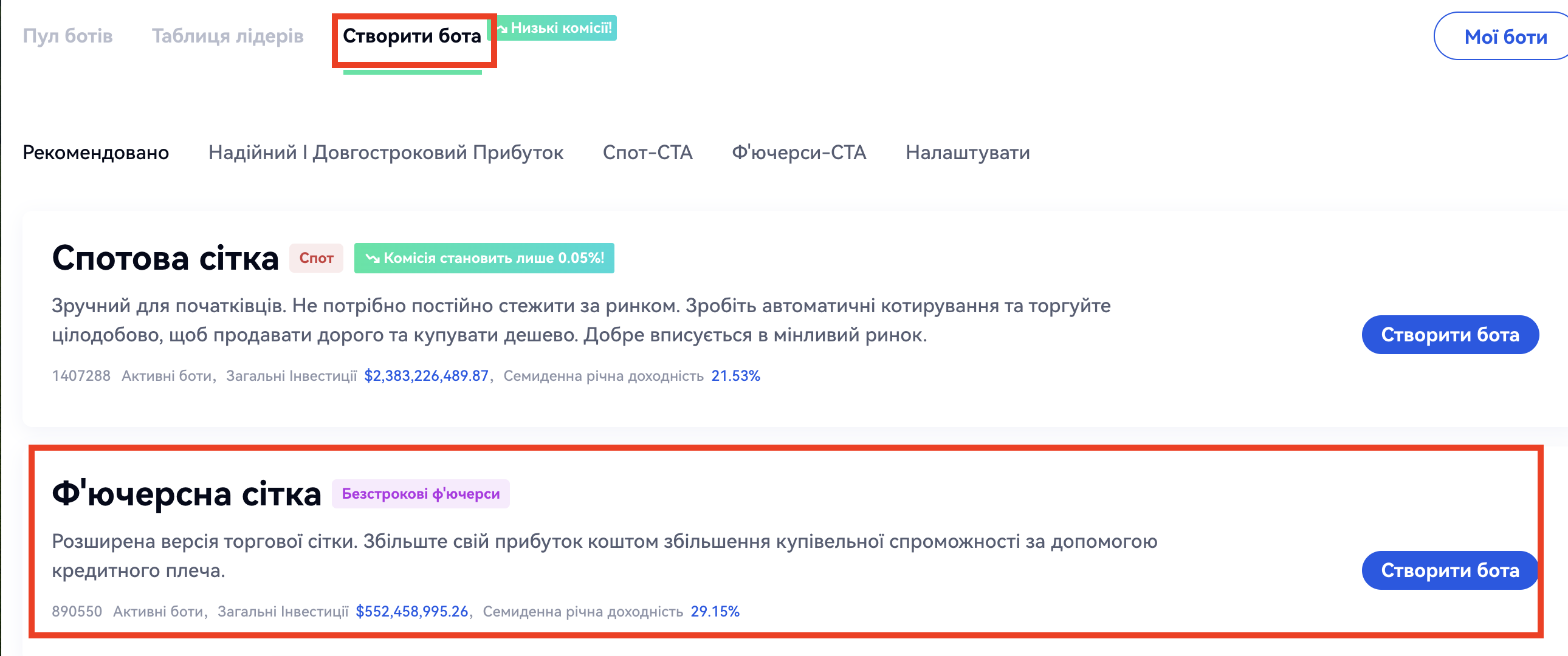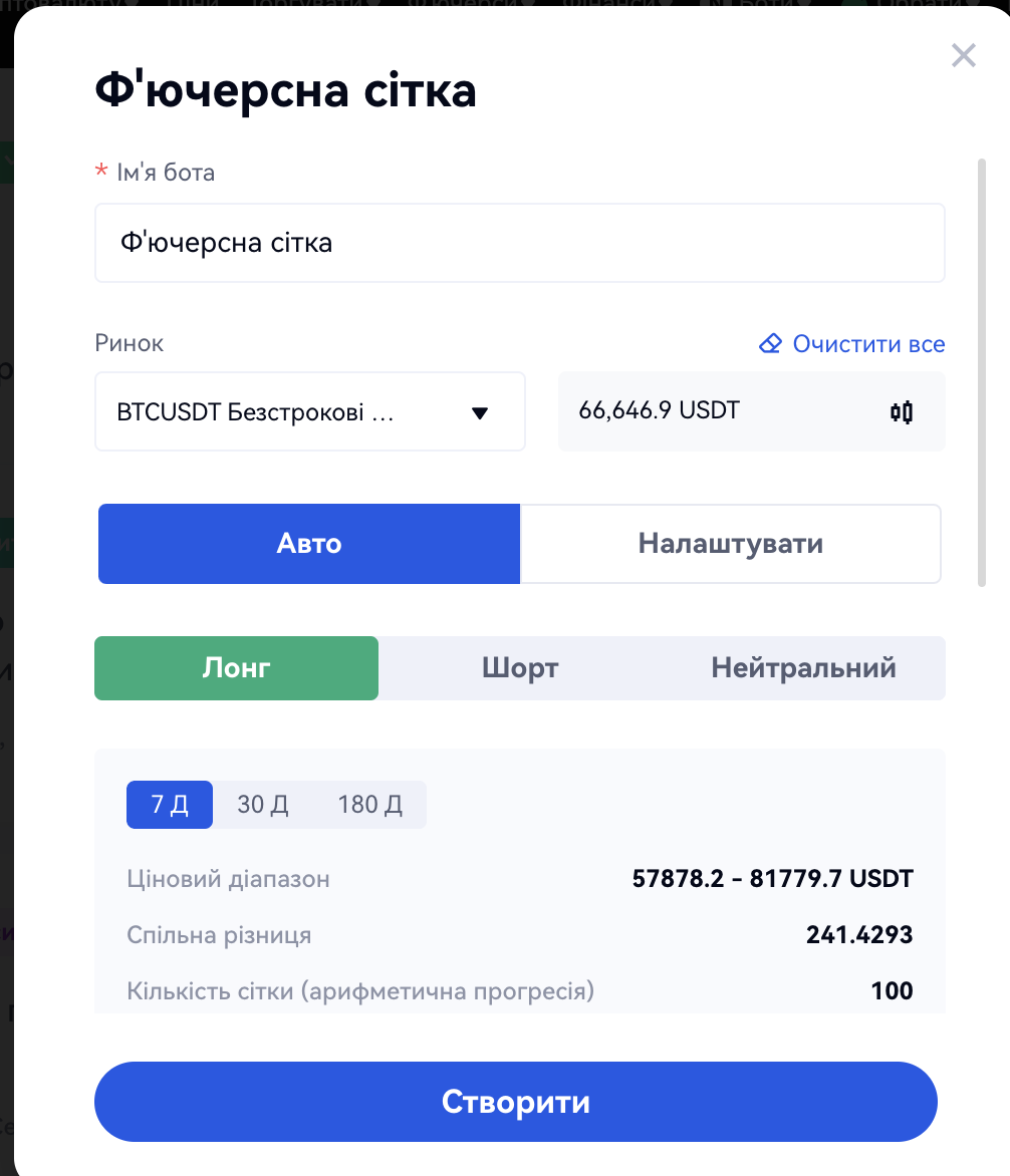 Панель навігації - "Копіювати торгівлю" - "Бот стратегій" - "Створити стратегію" - "Рекомендувати" - "Ф'ючерсна сітка" - "Створити стратегію". Далі виберіть торгову пару, налаштуйте параметри і натисніть на кнопку "Створити". Як показано на малюнку нижче: