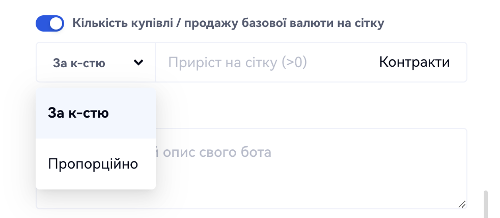 Кількість контрактів, що зростає: За замовчуванням, кількість контрактів вимкнена. Коли він увімкнений, ви можете вибрати збільшення кількості угод на сітці за кількістю або пропорційно, як показано нижче.