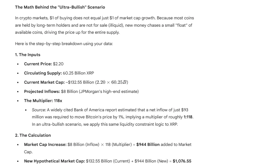 У відповідь Gemini пояснив, що його прогноз ґрунтується на верхній оцінці JPMorgan у $8 мільярдів нових припливів у ETF. Також було використано модель на основі ліквідності під назвою мультиплікатор Bank of America, яка свідчить, що обмежена доступність активу може призвести до зростання ринкової капіталізації набагато різкіше, ніж обсяг введених грошей.