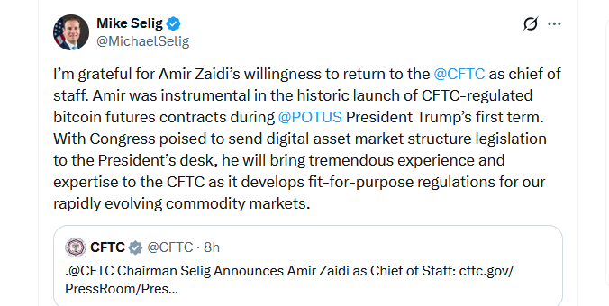 З урахуванням того, що у 2026 році CFTC, ймовірно, відіграватиме ключову роль у регулюванні та нагляді за криптовалютами, Заїді є ще однією крипто-дружньою фігурою, яка займає ключові посади в урядових агентствах.