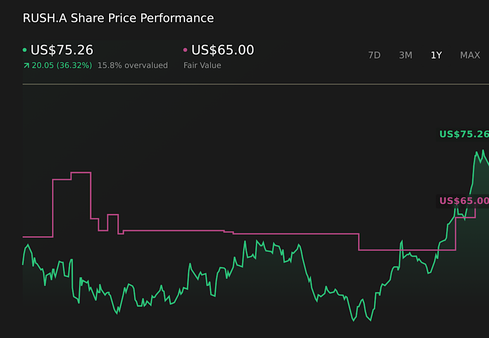Останнє оновлення моделі підвищило оцінку справедливої вартості Rush Enterprises з 65,00 доларів США до приблизно 78,67 доларів США, що свідчить про вищу імпліцитну вартість акцій на одну акцію, ніж раніше. Аналіз аналітиків, включаючи перехід до цілі 73 долари США та окреме підвищення на 10 доларів, сприяє цьому перезавантаженню та підкреслює, як оптимісти та песимісти переосмислюють історію на цих рівнях. Читайте далі, щоб дізнатися, як ви можете слідкувати за цими змінюваними припущеннями та бути в курсі еволюції аналітичного наративу навколо акцій.