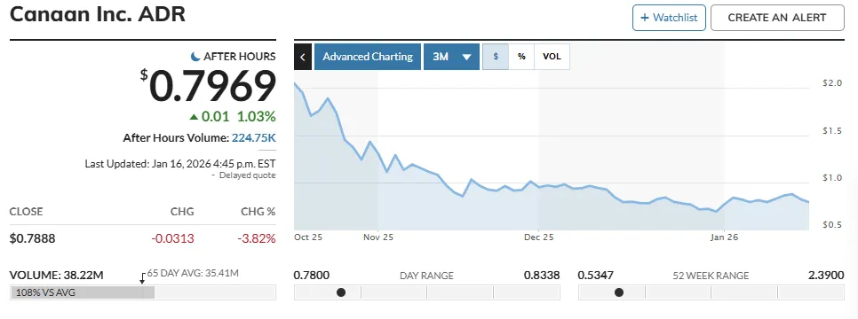 Trong vòng 30 ngày qua, cổ phiếu của công ty với mã ticker CAN đã giao dịch dưới mức tối thiểu là $1. Tại thời điểm viết bài, giá cổ phiếu của nhà khai thác khoảng 0,79 đô la.