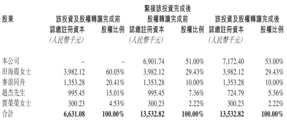 Sau giao dịch này, tỷ lệ sở hữu của Mật Tuyết là 53%, bà Tian Haixia nắm 29,43%, Mai Lang Tongzhou nắm 10%, Zhao Jie nắm 5,36%, và Jia Rongrong nắm 2,22%.