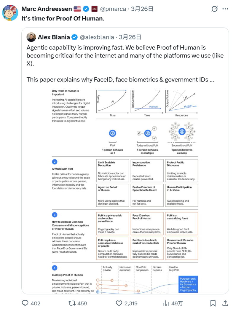 Ngày 26 tháng 3, đồng sáng lập a16z là Mark Andresen đã chuyển tiếp bài báo này trên nền tảng X và kèm theo một bình luận ngắn gọn nhưng nặng ký: Đã đến lúc con người phải chứng minh.