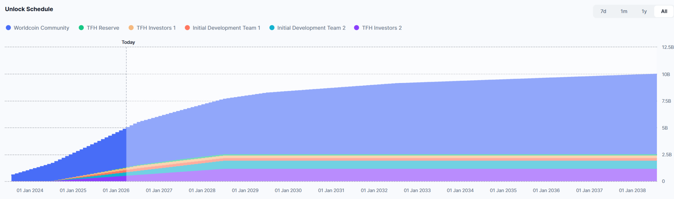 Ngoài ra, WLD mỗi ngày vẫn mở khóa tối đa 0.05% tổng cung, tương đương khoảng 5.32 triệu token, giá trị khoảng 1.479 triệu USD. Theo tính toán này, mỗi tháng lượng token được mở khóa có giá trị khoảng 44.369 triệu USD, dự kiến vẫn sẽ tạo ra áp lực bán đáng kể lên thị trường.