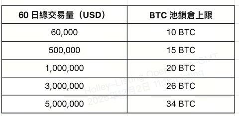 將根據 60 日總交易量確定鎖倉上限。達到更高的交易量,即可解鎖更高的質押額度。