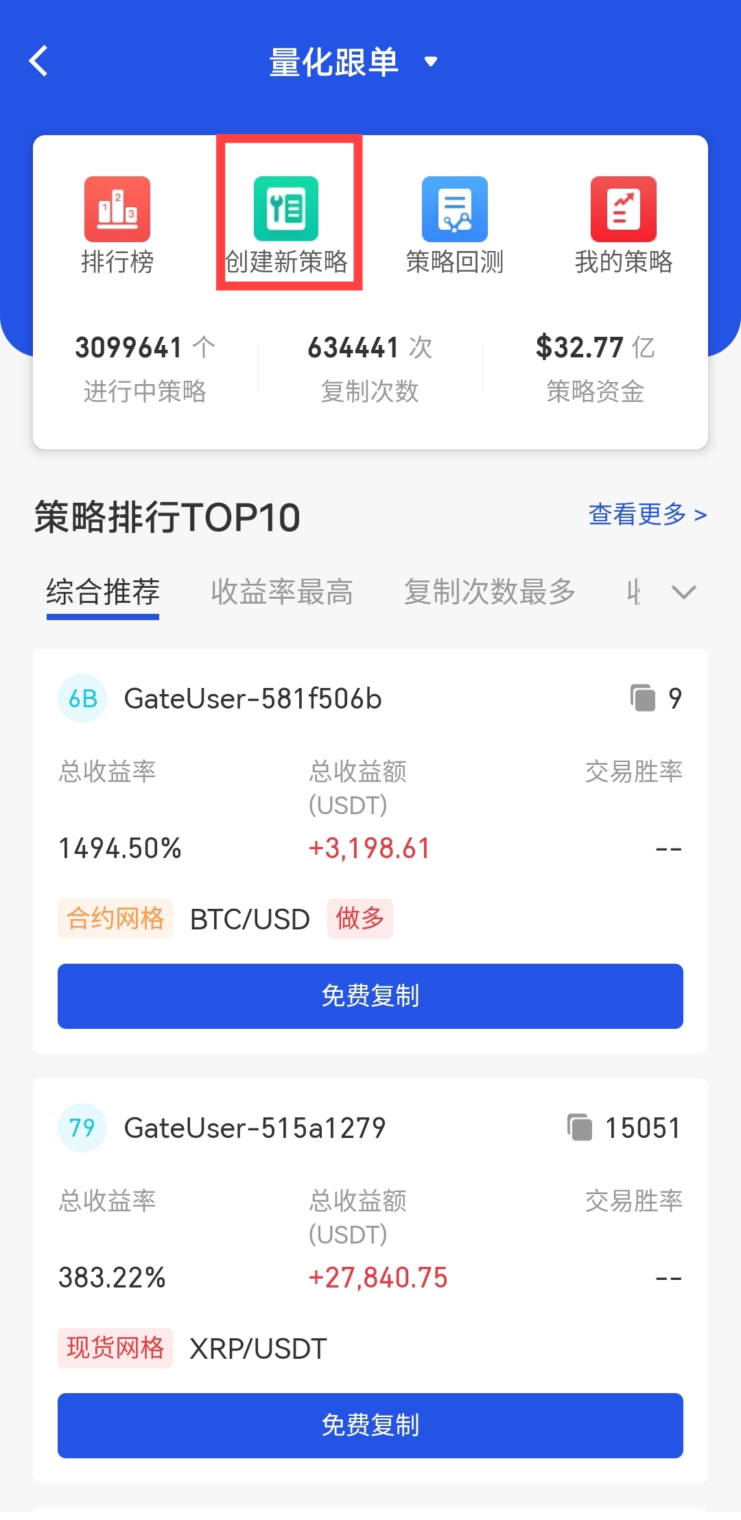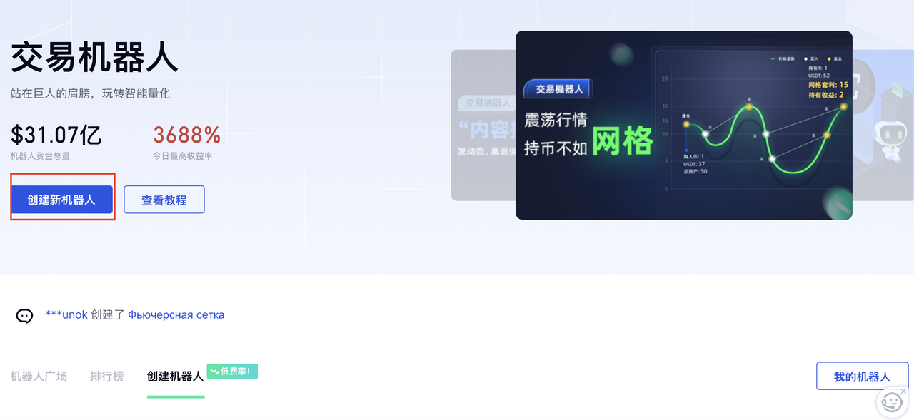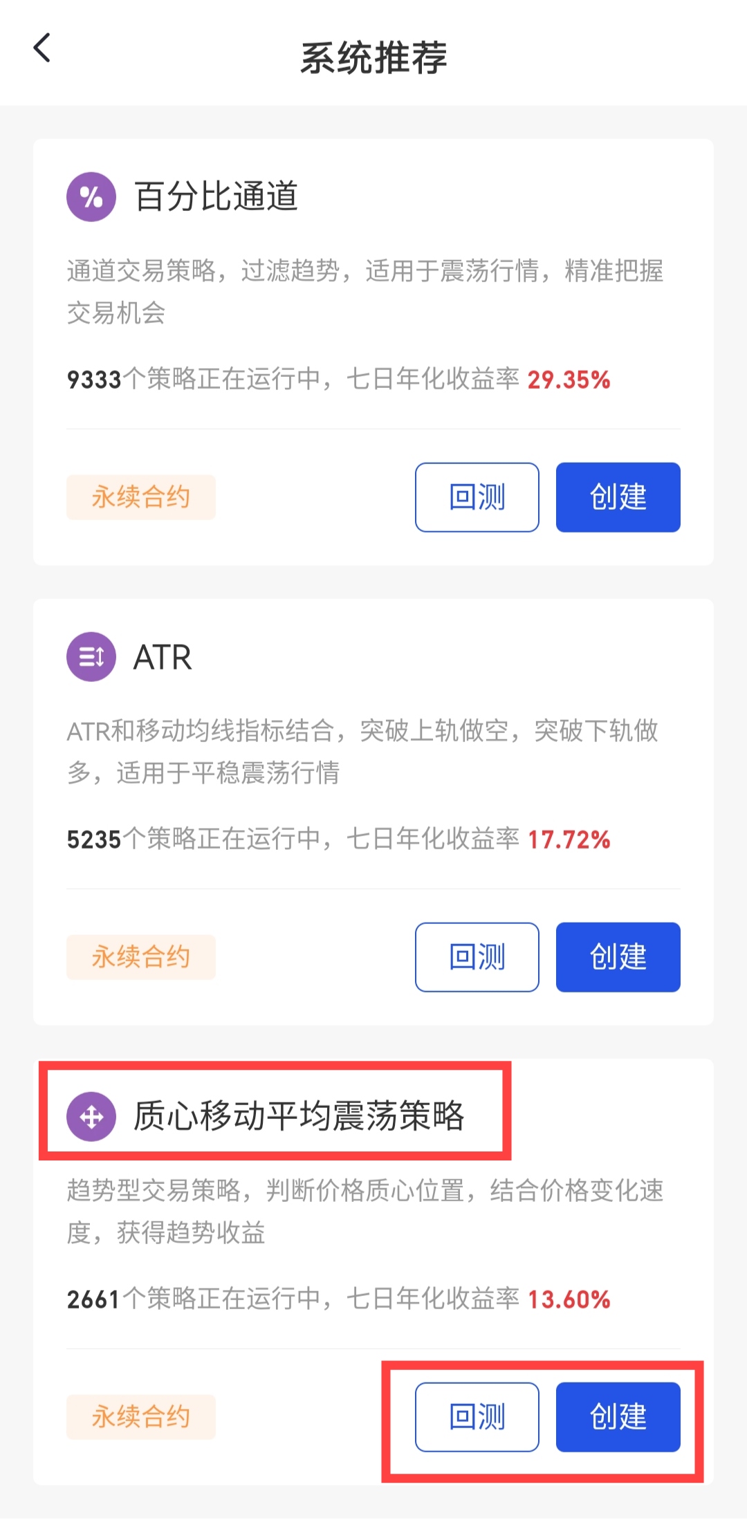 交易 - 交易機器人 - 點擊右上角返回icon - 創建新策略 - 系統推薦策略 - 質心移動平均震盪- 回測 - 設置參數 - 創建