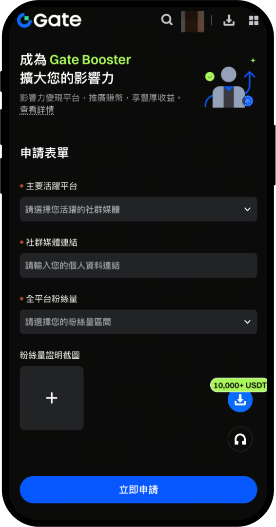 點擊左上角頭像 -【更多服務】-【活動】- 選擇【Gate Booster】,進入頁面後點擊【立即申請】。根據表單填寫相應平台、個人主頁連結、粉絲數量、證明截圖,並提交申請,平台將於 3 個工作日內完成審核。