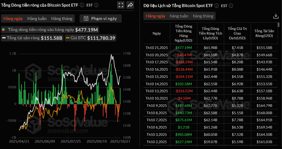在10月21日,加密市場見證了來自ETF基金的強勁投資潮。現貨比特幣ETF的淨流入資金高達4.77億美元,顯示出投資者的巨大信心和對比特幣的高需求。值得注意的是,所有12只比特幣ETF均沒有資金流出,顯示出穩定的購買壓力。