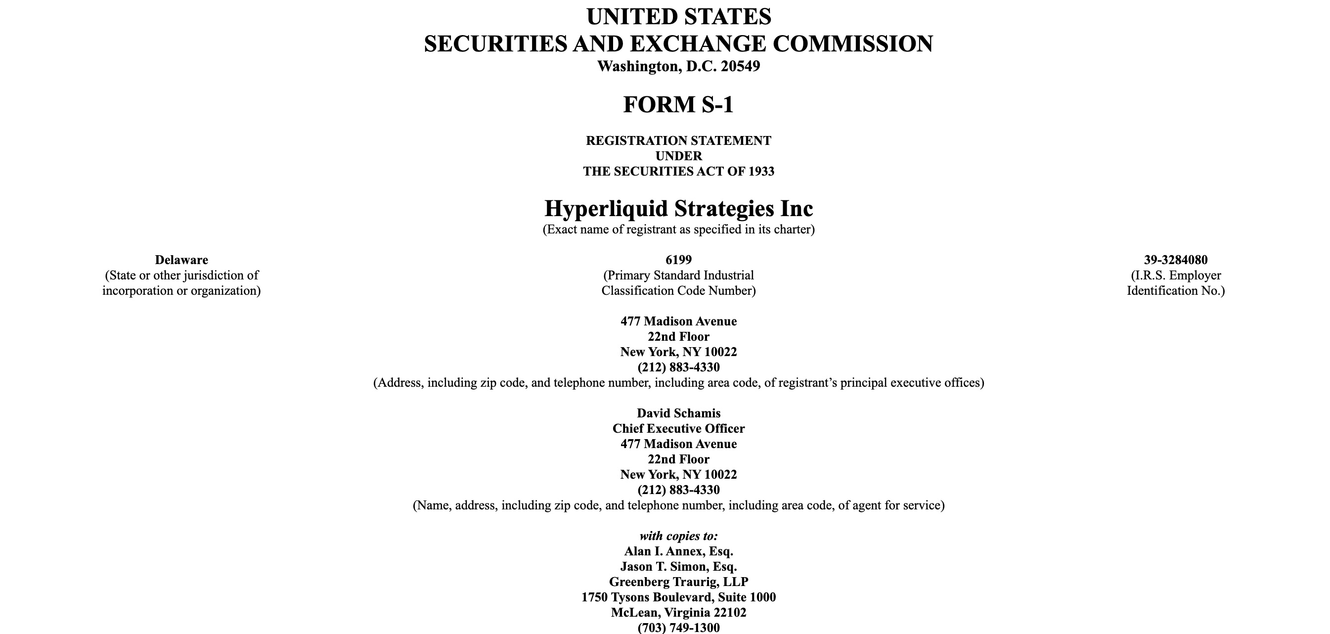 Hyperliquid Strategies Inc.,一家在加密和數字資產領域運營的公司,剛剛向美國證券交易委員會提交了S-1註冊申請(SEC),以發行最多160百萬普通股。此次發行將通過與Chardan Capital Markets合作的承諾股權設施進行,旨在籌集總資金最高可達10億美元。