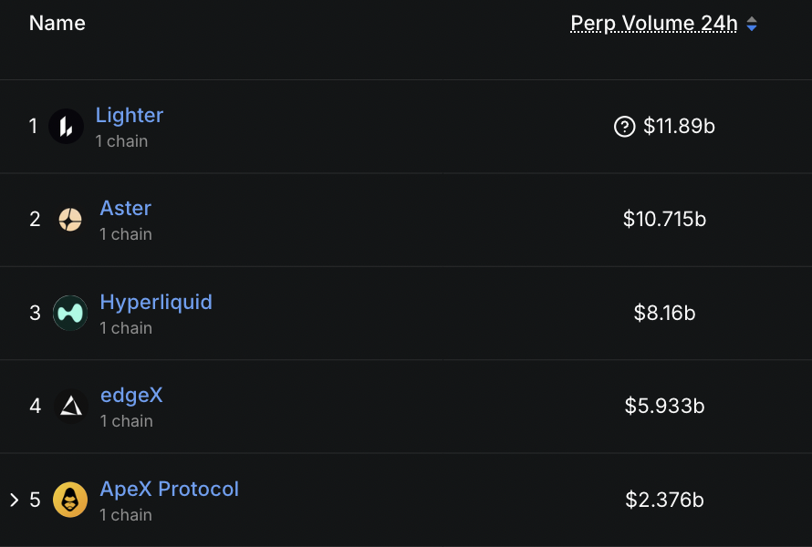 去中心化交易所(perp DEX) Lighter在過去24小時內以118.9億美元的交易量躍升至排行榜首位,其後是Aster (107.2億美元)和Hyperliquid (8.16億美元)。