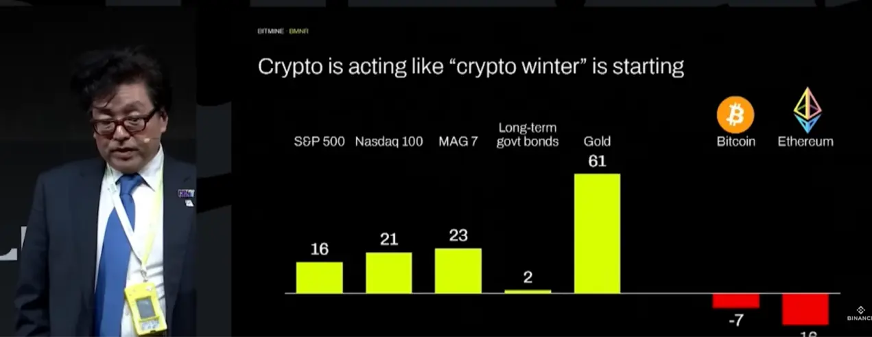 儘管看好加密貨幣的長期前景,但Tom Lee坦言,當前加密市場的表現如同「寒冬」,與傳統資產形成鮮明對比,黃金今年迄今上漲了61%標普500指數上漲近20%而比特幣和以太坊卻是負回報。Arca的Jeff Dorman有篇文章標題很好:「無人能解釋的拋售」。