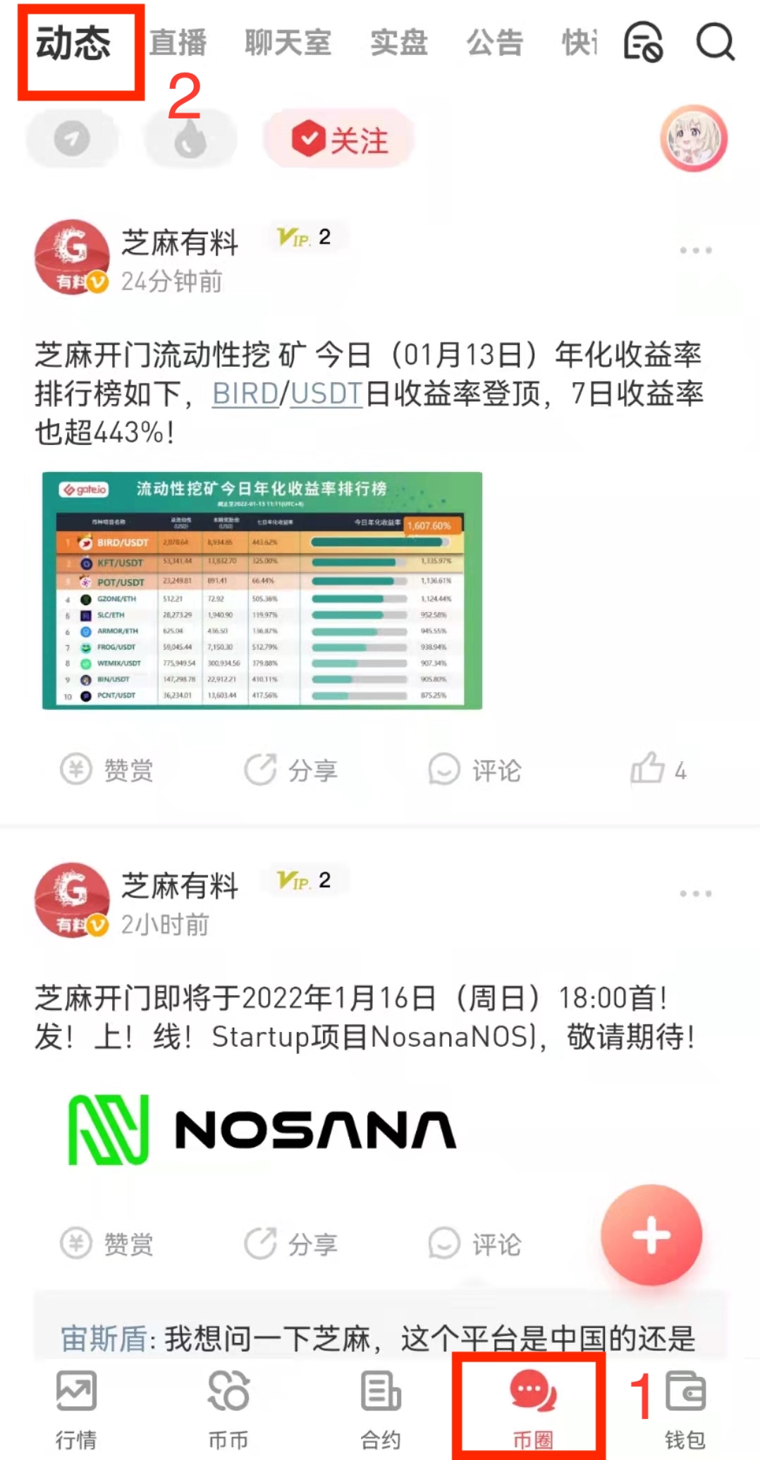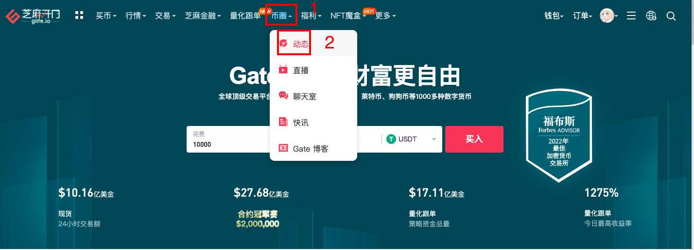 网页/客户端:登录网页端—菜单导航栏选择“币圈”页面,点击“动态”即可