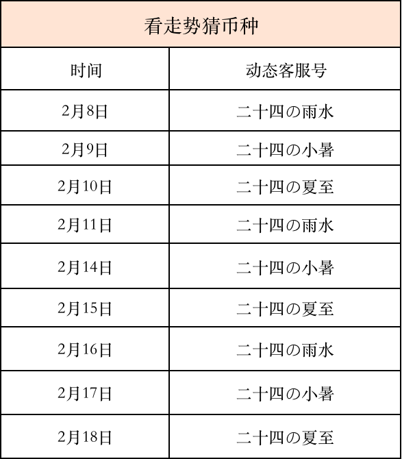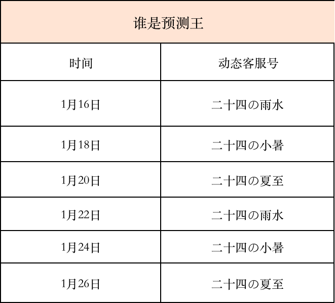 活动期间,将由客服动态号:二十四の夏至、二十四の小暑、二十四の雨水 发布币种涨幅预测动态,根据动态中给出的币种信息,用户预测次日涨幅最大的币种(预测的涨跌幅以北京时间0点为起始点),并在当日 18:00 前在活动文案下方进行评论,最终结果将在第三日进行公布,预测成功的前五名用户可获得精美周边一份(若全部下跌则以跌幅最小的币种为正确答案) 。