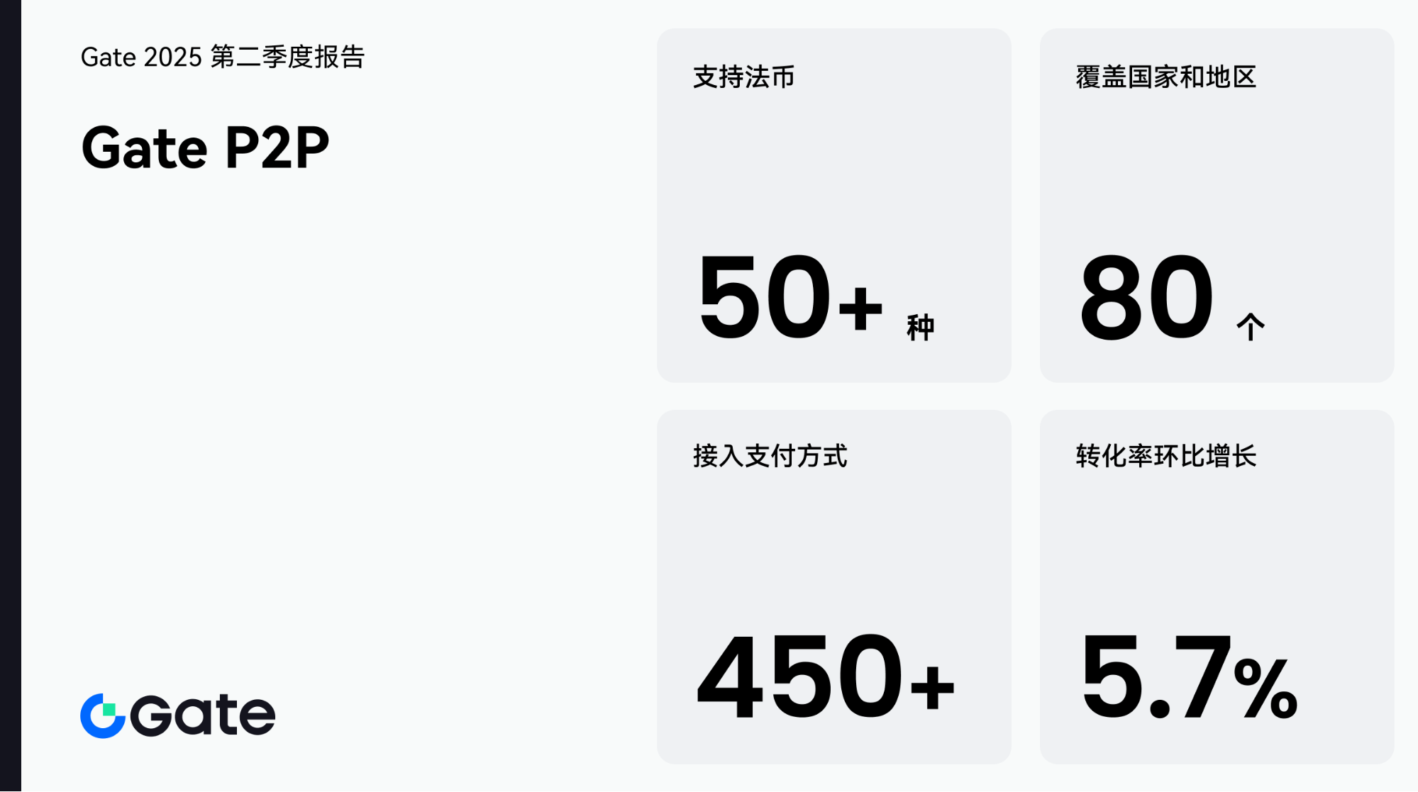 2025年第二季度,Gate P2P 业务保持强劲增长势头,全球覆盖能力和用户体验均实现显著提升,平台的市场影响力和业务规模持续扩大。全球覆盖能力持续增强,平台已支持 50+ 种法币,覆盖 80 个国家和地区,并接入 450+ 种支付方式,通过不断拓展全球支付网络,为用户提供了更加便捷、多样的交易渠道。与此同时,交易效率稳步提升,整体交易转化率环比增长超 5.7%,创下历史新高。这一数据反映了平台在优化用户交易体验方面的显著成效,用户对服务的满意度持续攀升,奠定了 Gate P2P 在行业中的竞争优势。