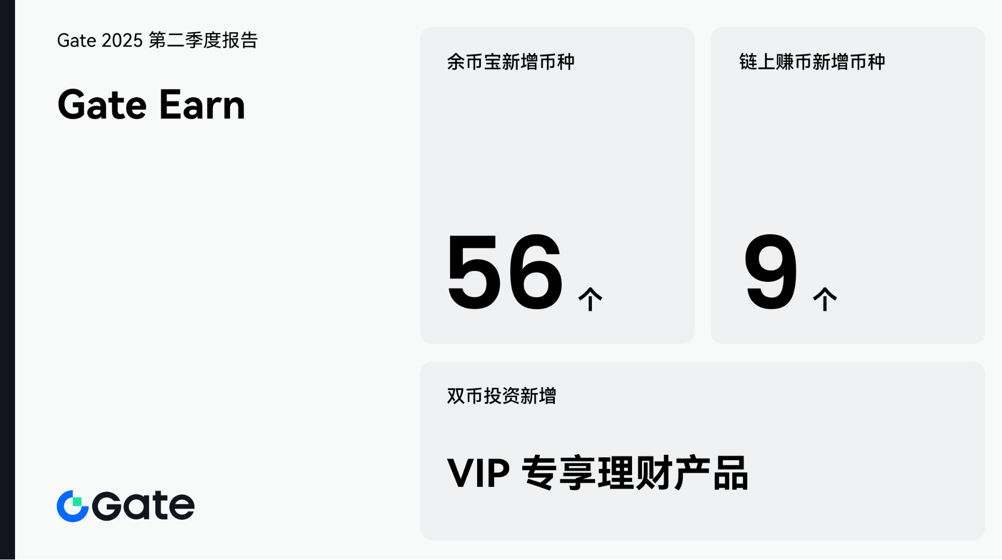 2025 年第二季度,Gate 理财持续推出高收益、灵活便捷且差异化明显的理财产品,并结合 VIP 专属权益与创新功能,显著提升了用户资金留存率与平台粘性,展现出强劲的增长势头和持续的产品创新优势,进一步巩固了行业领先地位。余币宝本季度新增 56 个币种灵活申购,上线最高年化 150% 的定期理财及 VIP 定期产品(USDT 年化收益达 4.5%)。同时,还推出行业独有的定期即时赎回功能,实现资金实时到账。