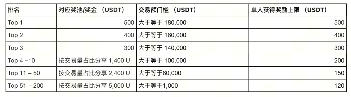 - 门槛要求:若当前排名区间的参赛用户均未达到该阶梯对应的最低交易量要求,则该部分奖励不予解锁发放,参赛用户奖下划至下一满足条件的阶梯进行分配。