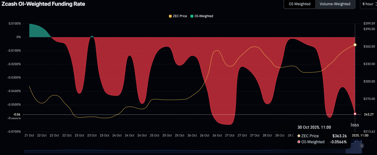 合约未平仓,代表未结算合约的名义总价值,正在稳步增加——这表明交易者对ZEC在短期和中期维持上涨趋势的能力充满信心。