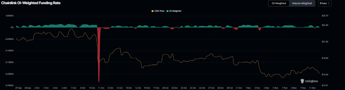 在衍生品市场上,LINK似乎正在准备一次反弹。根据Coinglass的数据,预测LINK价格下跌的交易者数量少于预期价格上涨的交易者。这个指标在周二转向积极,并在周三达到了0.0032%,这表明多头当前正在为空头支付费用,这是即将到来的上涨趋势的乐观信号。