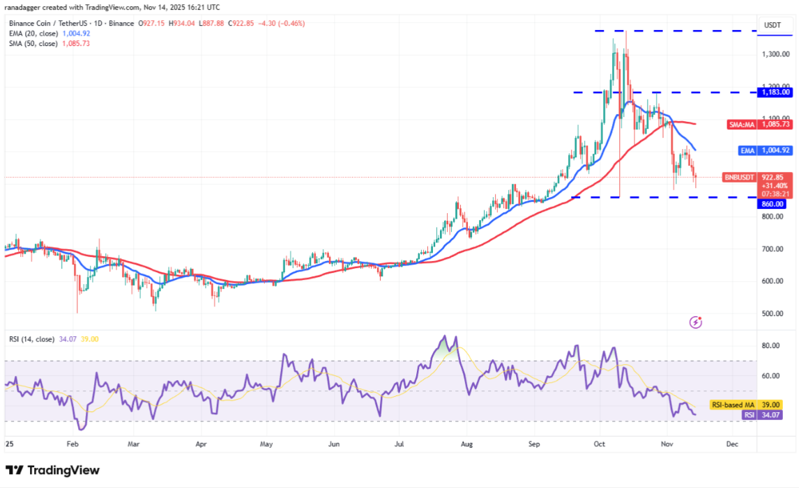 BNB正在逐渐跌向860 USD,这是短线关键支撑位。