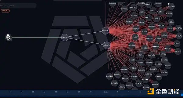 随后,转账模式开始爆炸式扩散。每一个第一波目的地立即再度扩散:0x62c7 推送至约 60 个新生成的钱包,0xD4B8 推送至另外约 60 个。数小时内,原本整洁的 10 钱包集群扩展为 100 多个一次性地址,全部并行注资,每个地址持有的金额都小到足以规避检测。