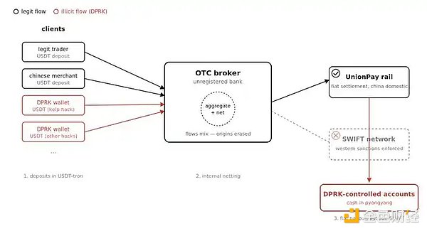 一批活跃于中国大陆和东南亚的场外交易(OTC)经纪商接收 USDT-Tron 存款,以本地货币现金结算。这些经纪商实质上是无牌照的地下钱庄。他们汇聚来自多个客户(合规与非合规)的资金流,在内部轧差,并通过中国国内支付网络(银联)以法币结算——银联完全在 SWIFT 体系和西方制裁执法范围之外运行。