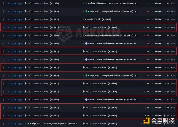 接收钱包 0x8B1 将 116,500 枚被盗 rsETH 分散转入其他 7 个分支钱包。每个分支随即进入 Aave 和 Compound V3,将一部分 rsETH 作为抵押品存入,并借出 ETH。