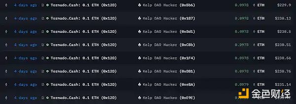 攻击发生约 10 小时前,8 个全新钱包通过 Tornado Cash 预先注资——Tornado Cash 是一个混币器,能切断资金来源与去向之间的关联。