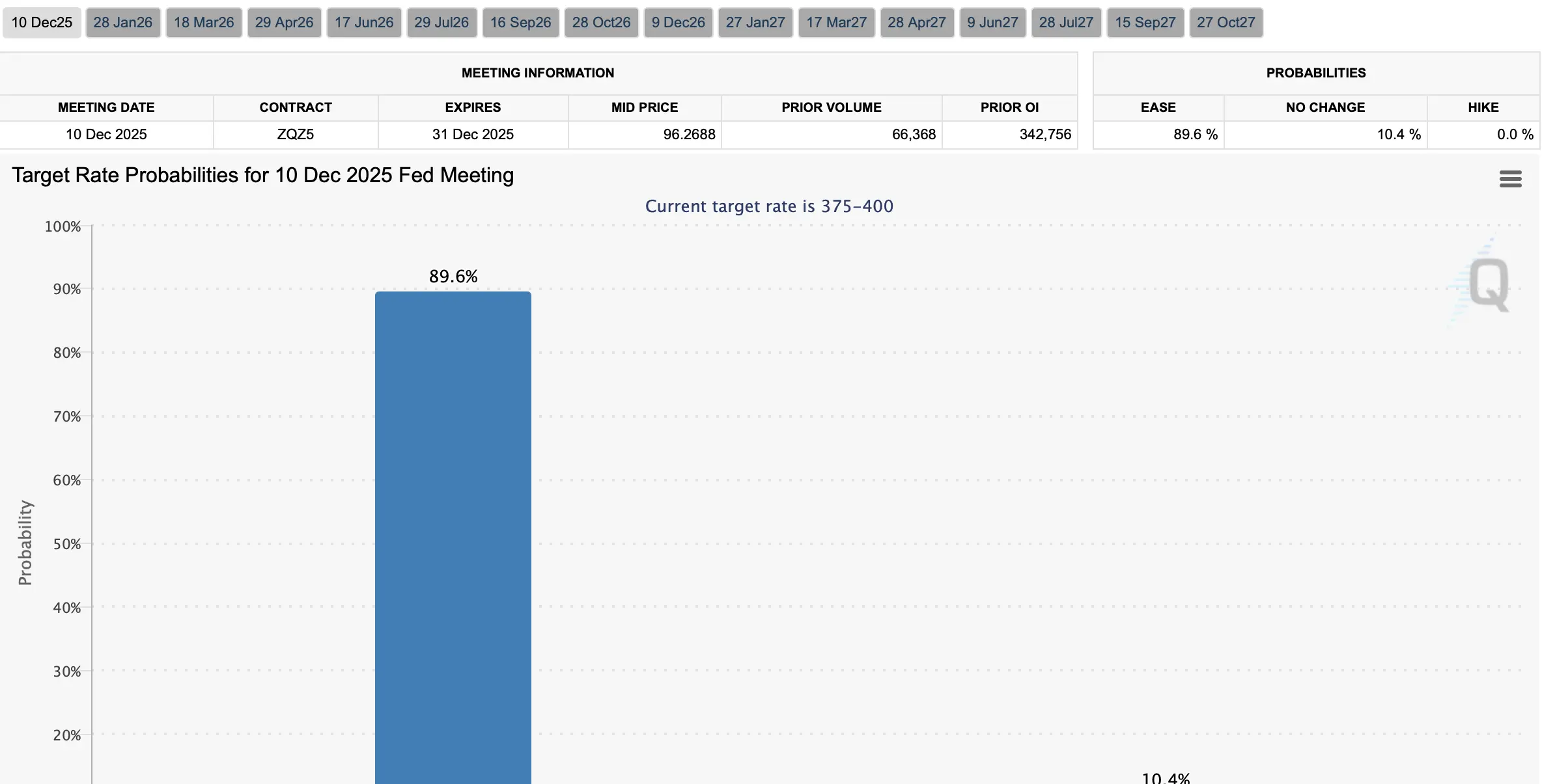 احتمالية خفض بمقدار 25 نقطة أساس تصل تقريبًا إلى 90 بالمئة، وفقًا لأسواق العقود الآجلة. وبما أن هذا السيناريو كان متوقعًا منذ أسابيع، فإن التجار لا يتوقعون رد فعل دراماتيكي عندما يتم نشر القرار.