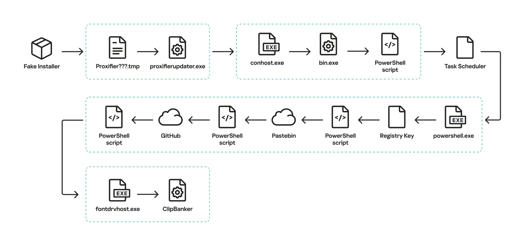 Троян скрыто разворачивается во время установки Proxifier, применяя технику бесфайлового заражения, при которой код работает в памяти. Затем по задаче из планировщика запускается скрипт из реестра, ведущий на GitHub. Оттуда цепочка получает файл с кодом — он внедряется в fontdrvhost.exe и разворачивает финальную нагрузку.