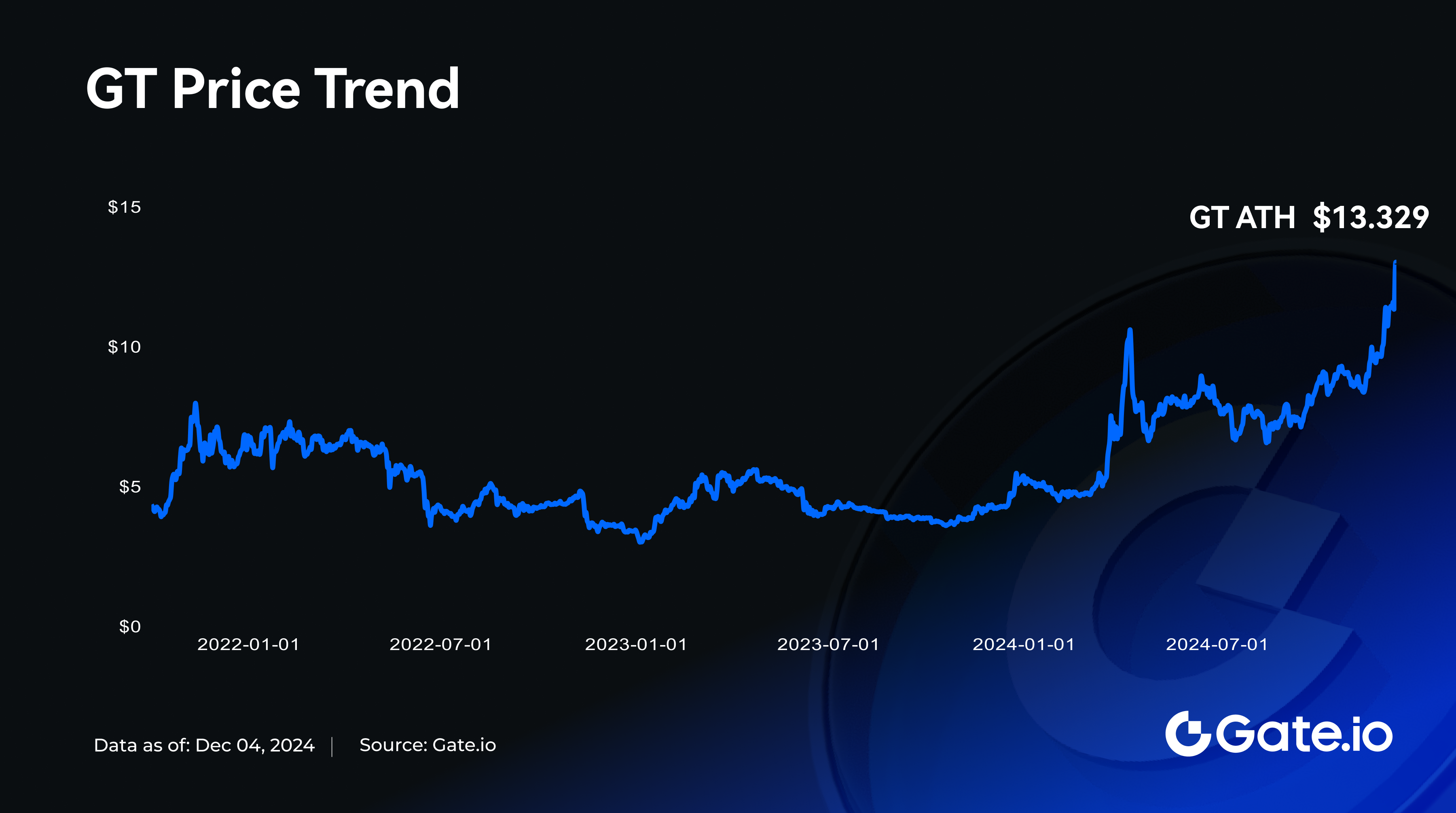 The cryptocurrency market is experiencing continued bullish momentum, significantly contributing to the rise in overall market capitalization. GT has recently undergone a period of striking price fluctuations. Today, GT peaked at 13.15 USDT, with the current price at 13.20 USDT, reflecting a 24-hour increase of 15.54%. This highlights GT's robust market momentum, with its price setting a new all-time high.
