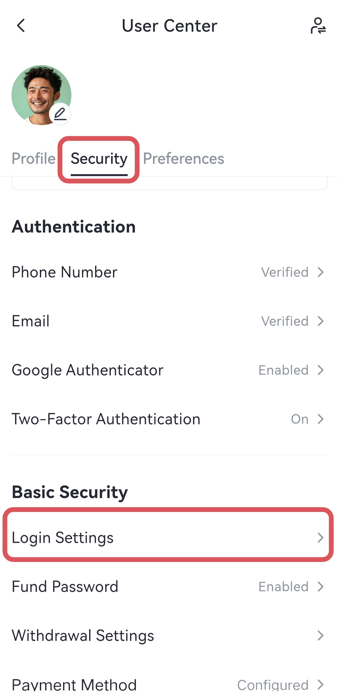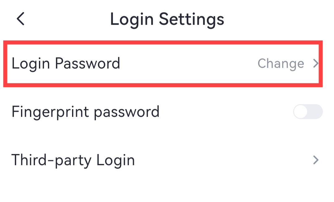Open Gate mobile app and log into your account. Click on the top-left profile icon and go to "Security Center" - "Login Settings"-"Login Password (Change)".