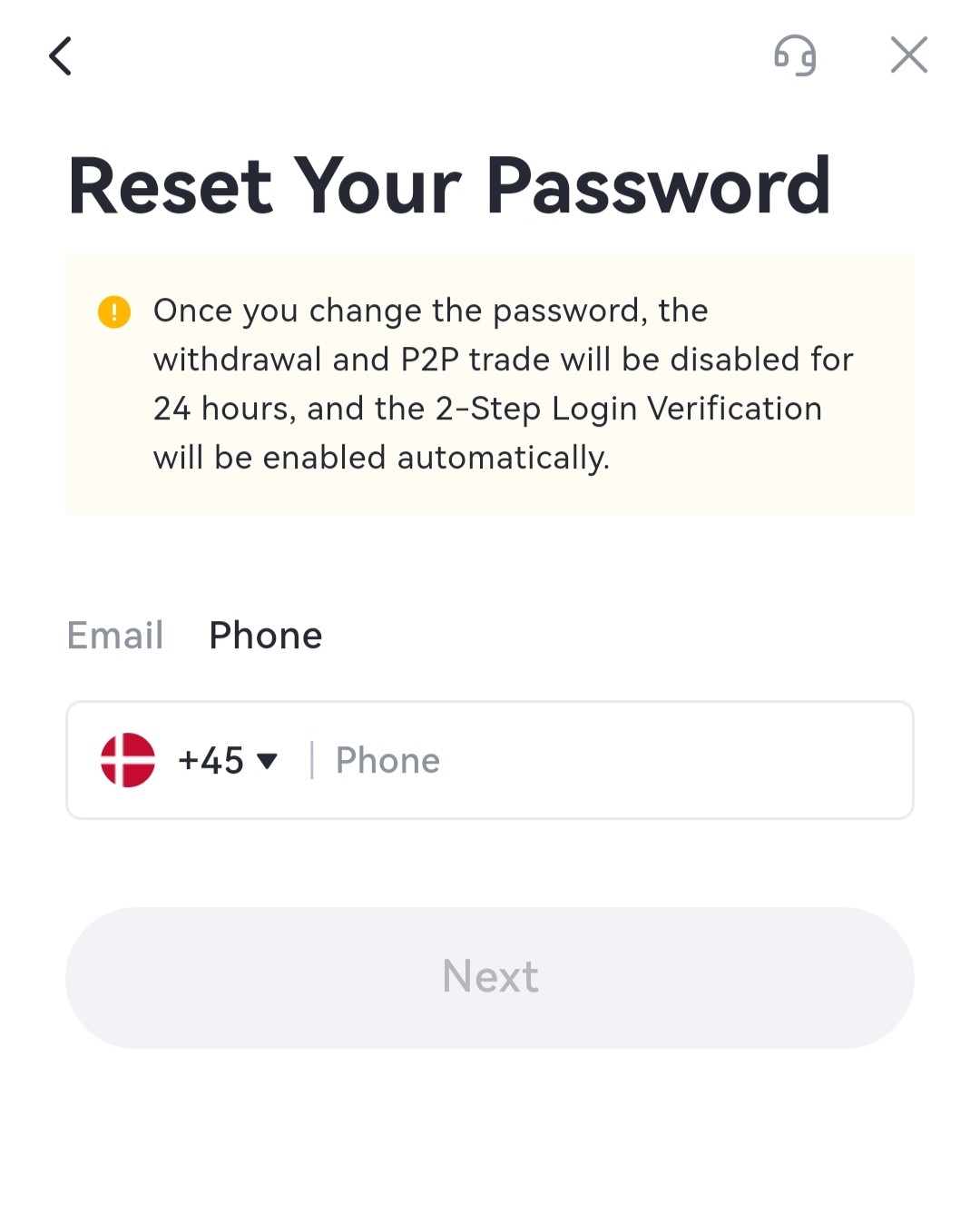 1.Withdrawal and P2P trading will be disabled for 24 hours after resetting the password.