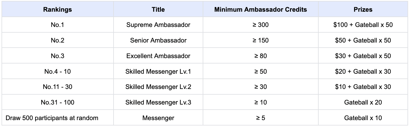 参加者は「アンバサダー クレジット」の量に基づいてランク付けされ、限定タイトルが授与されます。最低アンバサダー クレジットに達すると、豪華なギフトを獲得できます。