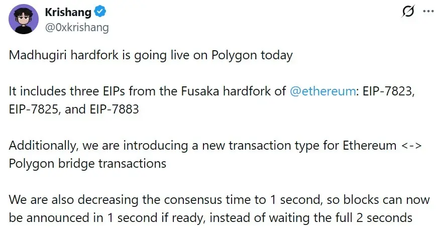 Madhugiriが稼働したことで、Polygonはインフラ基盤を強化しつつ、パフォーマンスを大幅に向上させることを目指しています。これらは、現実世界資産((RWA))のトークン化やステーブルコインなど、高頻度かつ高信頼性を要するユースケースの前提条件です。