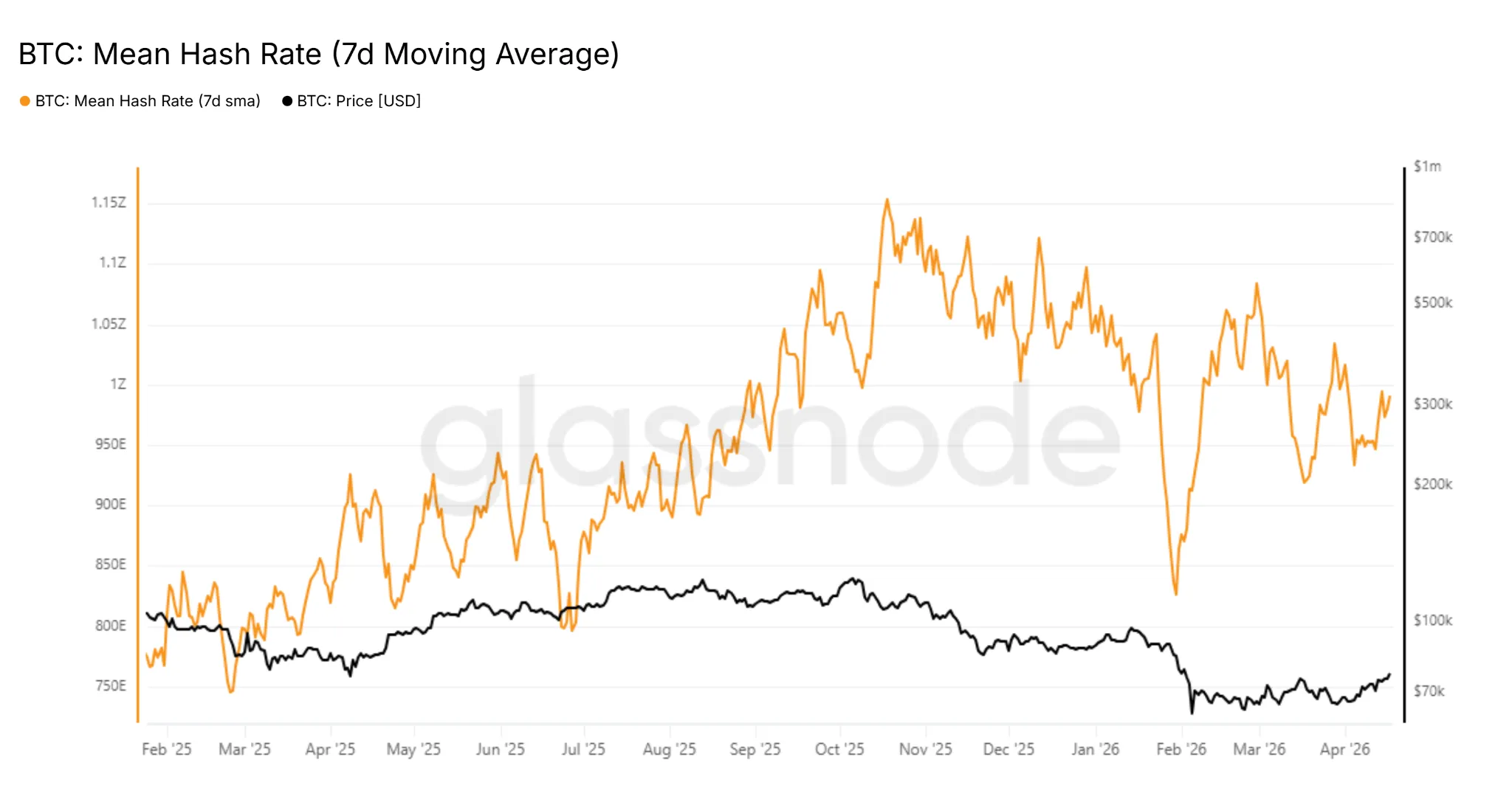 Glassnodeによると、月初からのネットワークの計算能力の平滑化された7日移動平均値は、約978 EH/sから約992 EH/sに回復しました。3月以降、値は1 ZH/sの重要なレベルを下回ったままです。