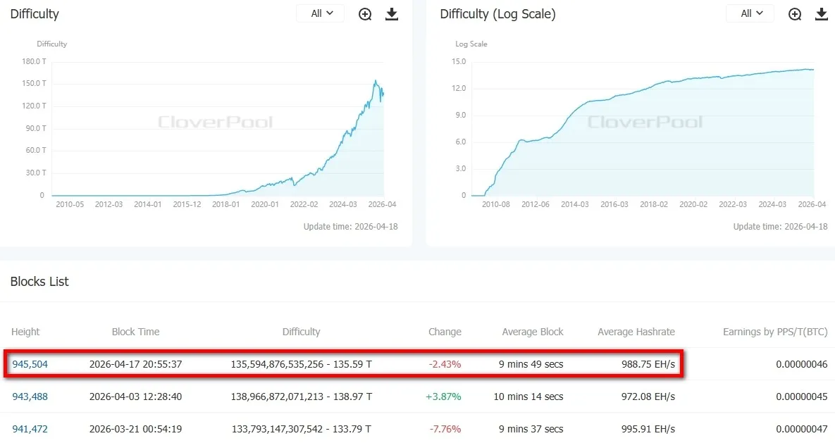 出典:CloverPool 作成時点の平均ハッシュレートは988.7 EH/sです。ブロック間隔は10分未満に短縮されました。
