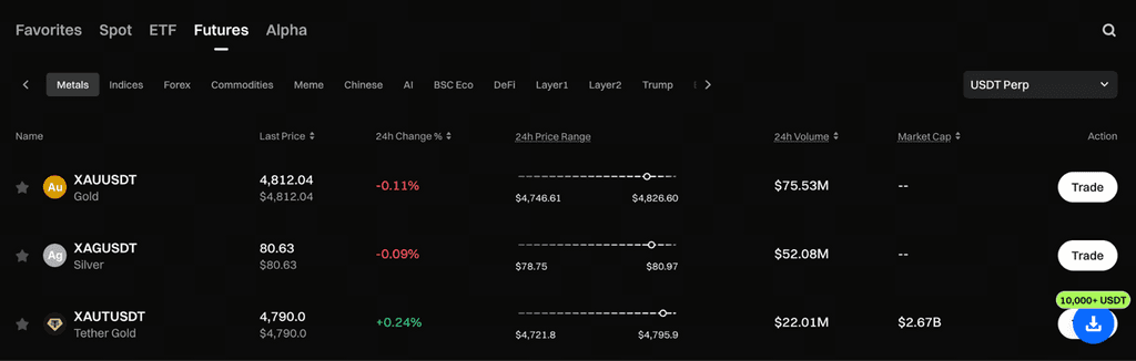 取引方法のデジタル化に伴い、貴金属市場への参加は従来のルートに限定されなくなった。Gateが提供する金属取引エリアでは、ユーザーはUSDTを通じて金と銀の永久契約取引に直接参加できる。