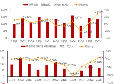 According to Founder Securities, in the first three quarters of 2025, core defense and military industry targets achieved revenue of 538.29 billion yuan, up 6.35% year-over-year; net profit attributable to parent was 29.61 billion yuan, down 4.55%, with the decline narrowing significantly. Excluding shipping, quarterly revenue and profit growth turned positive, with noticeable improvement each quarter. In Q3 2025 (excluding shipping targets), revenue increased by 28.57% year-over-year—the best since 2023; net profit attributable to parent in that quarter was positive for the first time in nearly seven quarters.
