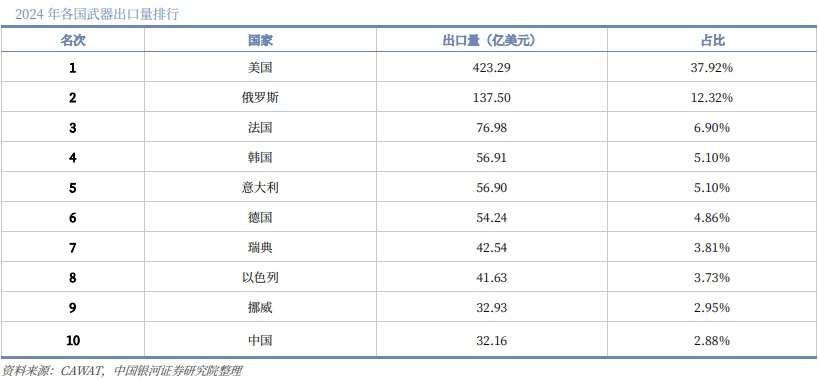 China Galaxy Securities cited data from the Russian International Arms Trade Analysis Center (CAWAT), estimating that the global military trade market will reach $111.6 billion in 2024, a year-over-year increase of 15.2%. The U.S. and China account for $42.33 billion and $3.22 billion respectively (about 22 billion RMB), representing 37.9% and 2.9%. As Chinese equipment gains international reputation (with the India-Pakistan conflict in 2025 highlighting Chinese gear), and based on current growth trends and geopolitical changes, China Galaxy Securities projects that over the next 5-10 years, China’s global market share could rise to 10-15%, with a potential market space of approximately 100-150 billion RMB, offering broad prospects.
