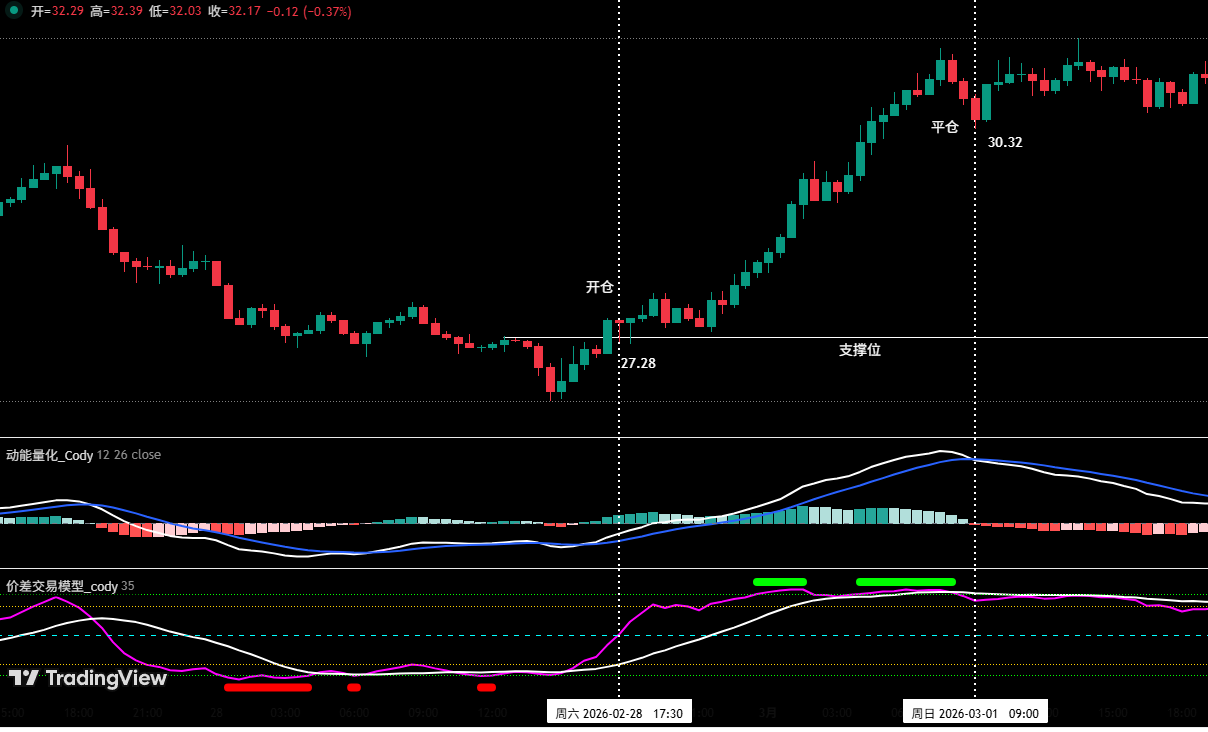 Entry decision (see Figure 3): Based on the forecast of the main upward trend; simultaneously, the spread quantification model issued multiple bottom warning signals (red dots), which resonated with the momentum quantification model’s bottom signals; after the price broke through key previous resistance zones and stabilized, a long position was opened at $27.28.