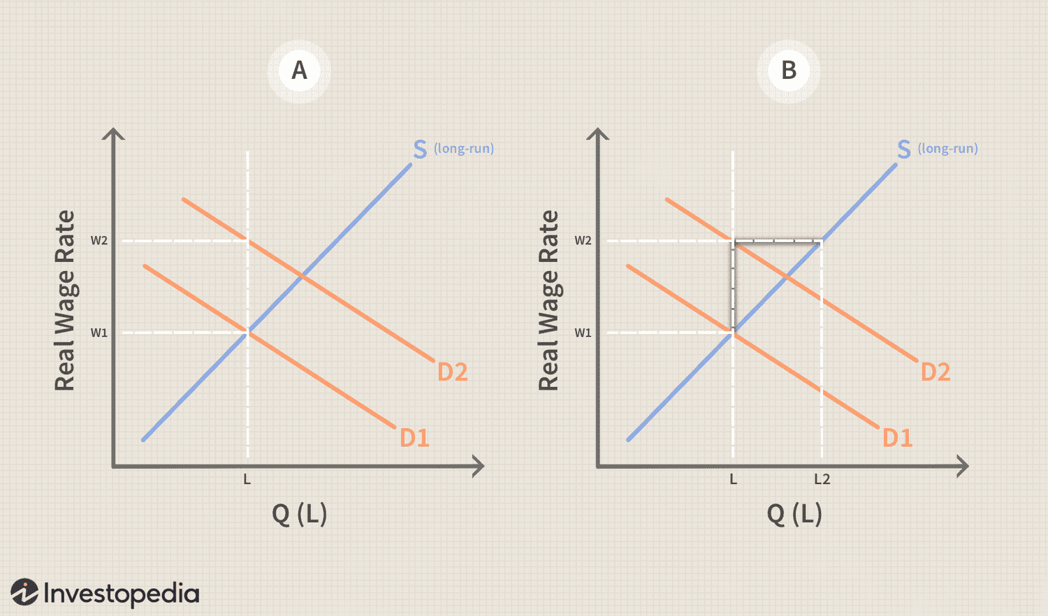 Instead of the increase in wages being along the long-run labor supply curve (S), it’s along the more inelastic short-run labor supply curve (L). The short-run curve is more inelastic because there is a limited number of workers who have or are able to immediately train for the new skill set. As more and more workers are trained (graph B), the supply of labor shifts right (L2) and moves along the long-run labor supply curve (S).